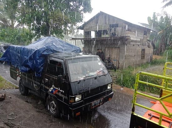 Saat memberikan bantuan kepada masyakarat korban gempa Pasaman yang diantaranya ke Nagari Malampah Kabupaten Pasaman sempat terjadi kendala hujan namun setelah hujan sedikit reda penyaluran bantuan dilanjutkan.