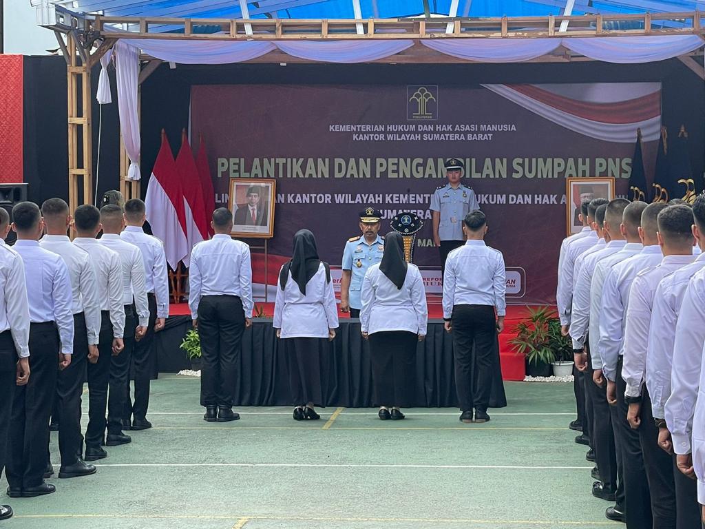 Sumpah Jabatan yang dilakukan oleh perwakilan CPNS dan ditandatangani oleh Haris Sukamto, AKS., SH., MH Kakanwil Kemenkumham Sumatera Barat.