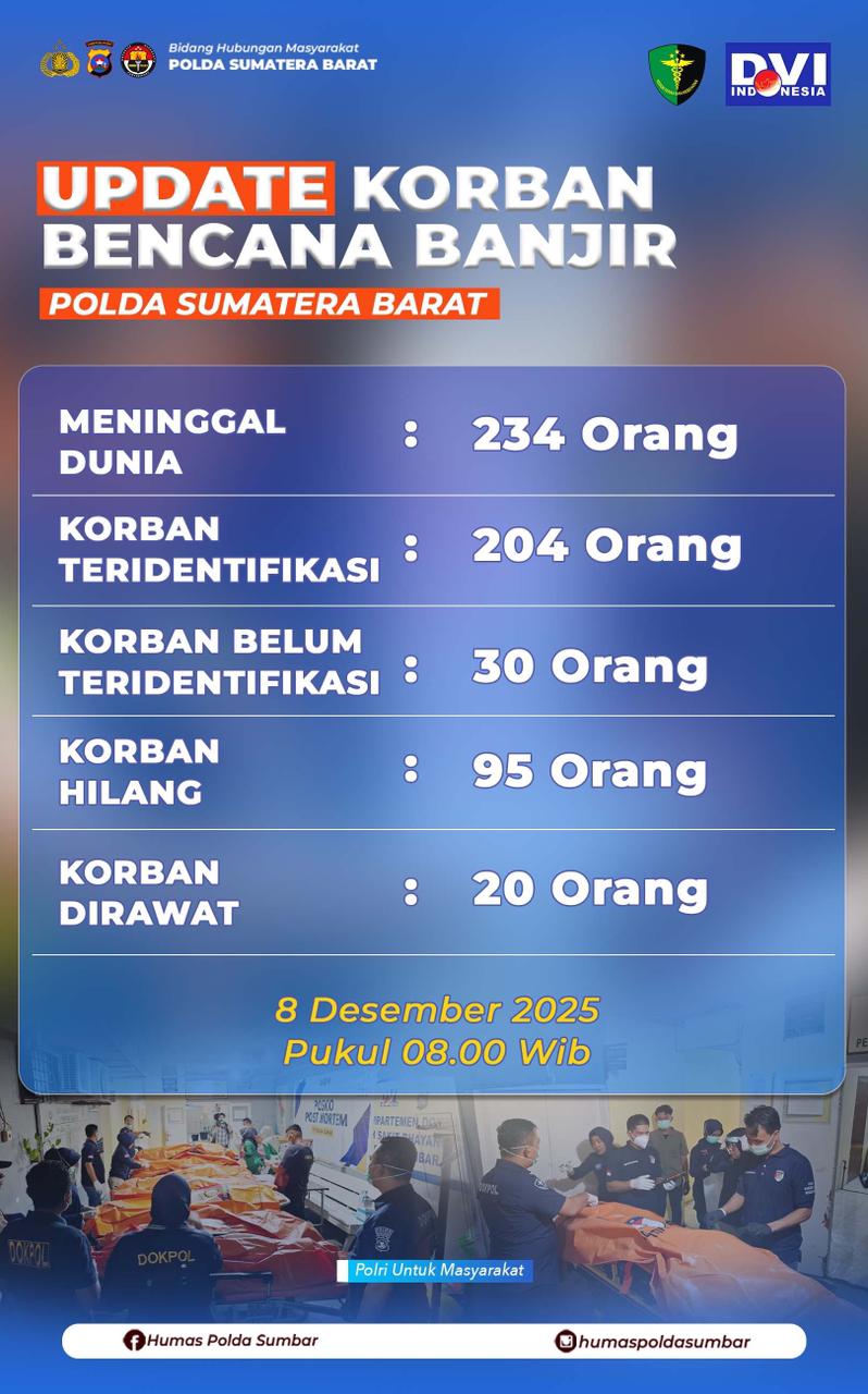 Hingga Senin, 8 Desember 2025 pukul 08.00 WIB, Tim Disaster Victim Identification (DVI) Polda Sumatera Barat merilis data terbaru yang mencatat total 234 korban meninggal dunia telah berhasil dievakuasi dari berbagai titik terdampak. Laporan ini menunjukkan peningkatan jumlah korban dalam dua hari terakhir seiring proses pencarian yang semakin meluas.