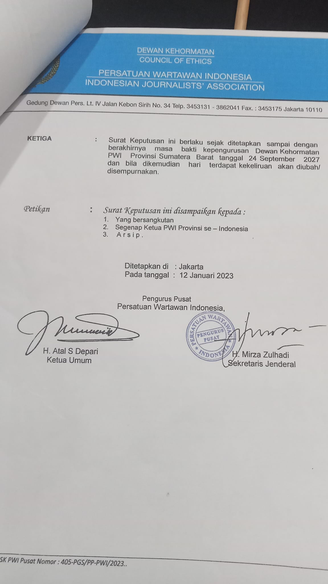 Pelantikan Pengurus PWI Sumbar 2022-2027 Resmi dilantik PWI Pusat | Foto : akun Facebook yon.erizon