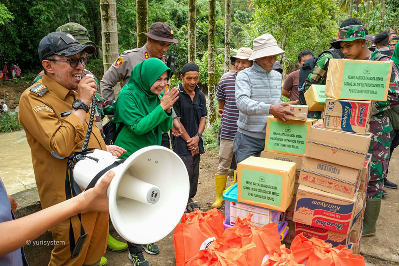 Pada kesempatan yang sama, Bupati dan rombongan secara simbolis menyerahkan paket bantuan kepada warga yang membutuhkan. Bantuan tersebut meliputi paket sembako, beras, minyak goreng, dan perlengkapan khusus untuk bayi. Penyerahan bantuan ini merupakan bagian dari upaya pemerintah daerah untuk meringankan beban yang ditanggung warga akibat banjir bandang.