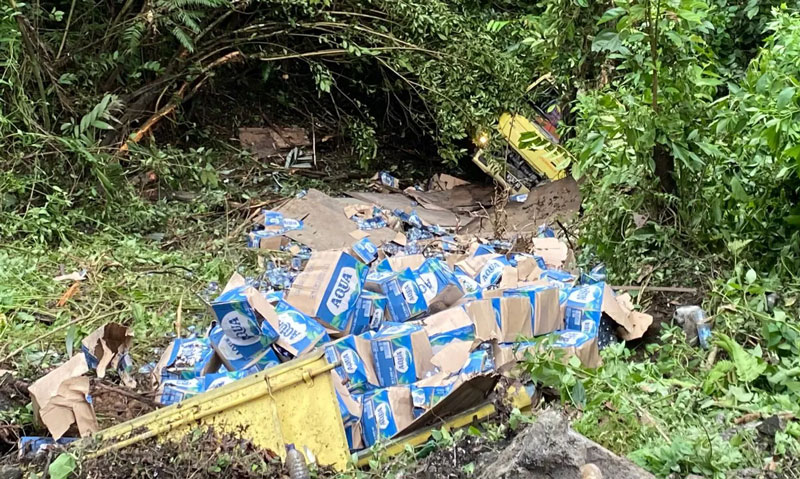 Laju mundur yang tidak terkendali menyebabkan roda belakang keluar dari bahu jalan hingga akhirnya truk air mineral terjun ke jurang sedalam 15 meter. Kendaraan tersebut terguling beberapa kali sebelum akhirnya terhenti di dasar jurang dalam posisi terbalik. Muatan air mineral yang ada di dalam boks turut berserakan di sekitar lokasi kejadian akibat benturan yang sangat keras.