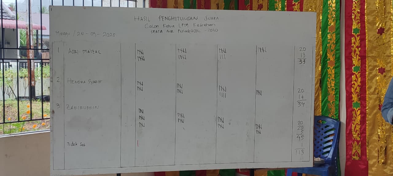Dari hasil penghitungan suara, Zakiruddin berhasil memperoleh dukungan terbanyak dengan 45 suara, disusul oleh Hendra Syarif dengan 34 suara, dan Adri Maizal dengan 33 suara. Sementara itu, terdapat 1 suara yang dinyatakan tidak sah. Dengan hasil tersebut, Zakiruddin resmi terpilih sebagai Ketua LPM Kelurahan Mata Air periode mendatang.